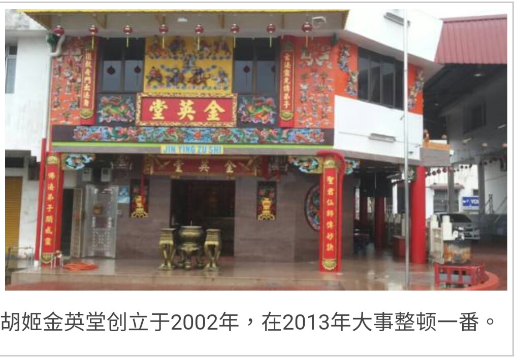新山淡杯胡姬金英堂创立于 2002 年,在 2013 年大事整顿,由金英祖师、茅山法主及潮源洞师八尺金身坐镇,在宗师带师传教下,发扬金英教及修金英法。